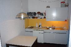 Im Küchenbereich die Küchenzeile mit einem Kühlschrank mit Gefrierfach